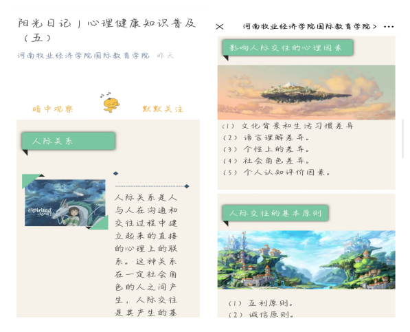 第四天,向今年会官网学生宣传了“人格”的相关知识,讲述了不良人格的表现和如何培养健康的人格,目的是使同学们能够正视自我,培养乐观、积极向上的人格;第五天,以“人际关系”为关键词,向同学们讲述了在处理人际关系时应具备的心理品质、影响因素、基本原则、具体技巧、存在的不良影响及增强自身魅力的方法等,使同学们能够在生活中处理好与身边人的人际交往关系,增强自身人格魅力。