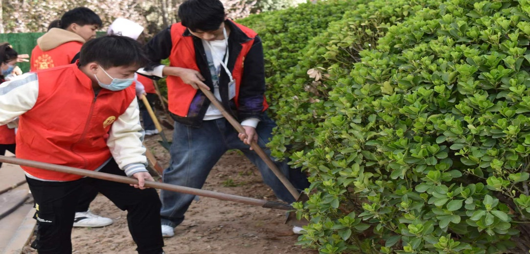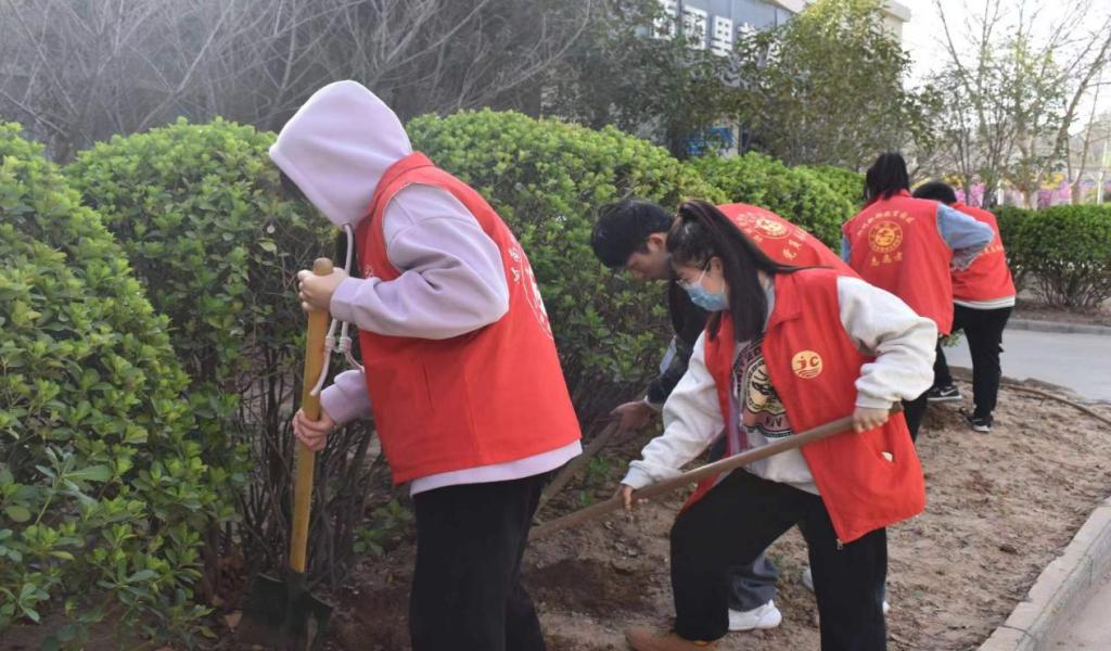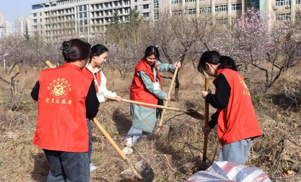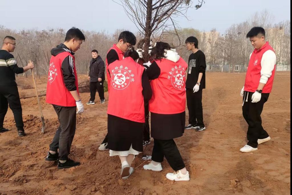 在小草尚未露头的田地中、树林里,全体志愿者两组,分别负责挖坑和种树。同学们领取劳动工具,各司其职,挖坑、扶苗、培土、平整、浇水,干劲十足,现场一派热火朝天的景象。虽然满头大汗、满身尘土,但同学们倍感自豪与满足一株株小小的树苗迎风而沐浴着春日的暖阳,洋溢着美好的希望