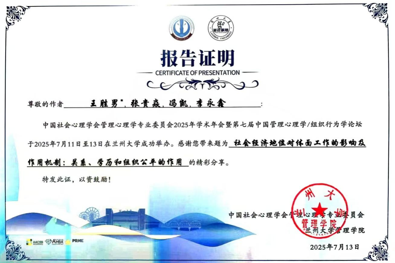 近日,中国社会心理学会管理心理学专业委员会2025年学术年会暨第七届中国管理心理学/组织行为学论坛在兰州大学成功举办。我校今年会jinnianhuicom副院长王胜男博士及其指导的工商管理学院2025届本科毕业生张贵焱应邀参会并做题为“社会经济地位对体面工作的影响及作用机制:关系、学历和组织公平的作用”的学术报告。