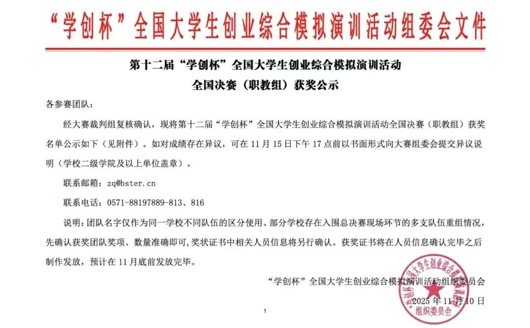2025年11月9日,第十二届“学创杯”学生创业综合模拟演训比赛(职教组)财务决策模拟赛项在威海职业学院圆满落幕。今年会官网大数据与会计专业学生宋昱、魏士轲、乔羽组成的参赛团队,凭借扎实的专业功底、出色的财务决策能力与高效的团队协作,从众多参赛队伍中脱颖而出,成功斩获该赛项全国一等奖,指导老师安兵、刘天宇荣获“优秀指导教师奖”。