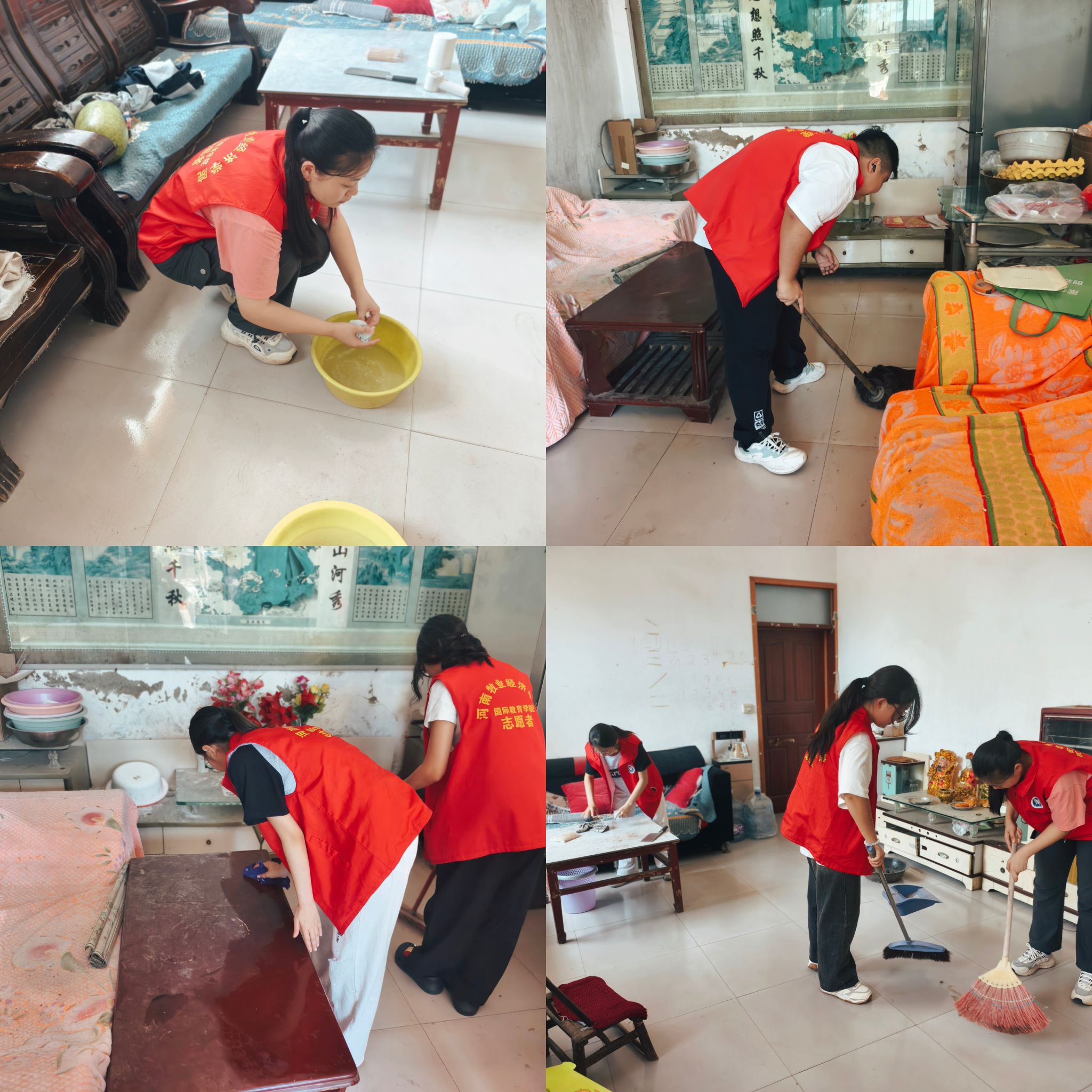 为解决农村空巢老人居住环境欠佳、情感陪伴缺失等实际问题,队员们分工协作,迅速投入到志愿服务中。在环境清洁方面,志愿者有的手持扫帚细致清扫院落角落的积尘,有的端来清水认真擦拭桌椅与窗户,让蒙尘的家具重焕洁净光泽,还有的手握拖把反复拖洗地面,连墙角的灰尘、桌腿的污渍都一一清理干净。在情感关怀环节,志愿者们利用打扫间隙主动与老人唠家常,关切询问老人的身体状况和生活需求,耐心倾听老人讲述过往故事。原本安静的小屋充满欢声笑语,浓浓的温情在彼此间流淌。