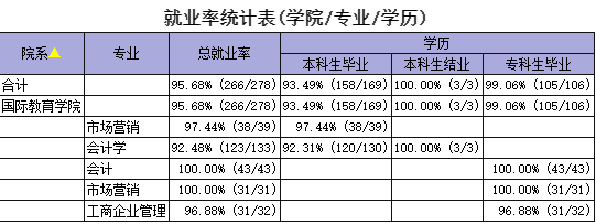 通过多方面的努力,今年会官网2018年的就业率达到了学校预期的各阶段目标,2018年毕业生总数278人,就业人数266人,毕业生最终就业率(2018年9月)达到88.85%,年终就业率(2018年12月底)达到95.68%,毕业生就业质量较高,学生自主创业人数多。其中银行11人,事业单位及国企11人,教师岗位应聘5人,就业统计工作真实、准确、有效,毕业生就业质量较高。