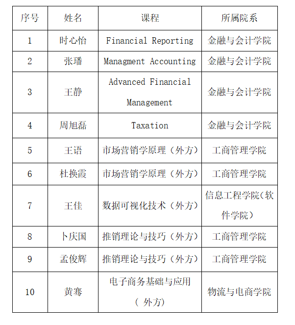 5.课件(PPT):本科ACCA课程课件英文比例100%;其他本科双语课程课件英文比例不低于50%,专科双语(外方)课程课件英文比例不低于30%。